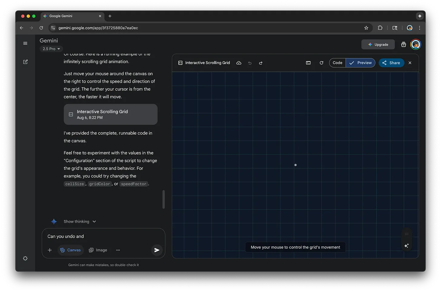Before I wrap this up, there was a tangible example I was working on where a lot of these issues came to light. I was creating the following animation, where the speed and direction of the infinitely scrolling grid will vary based on the mouse position: