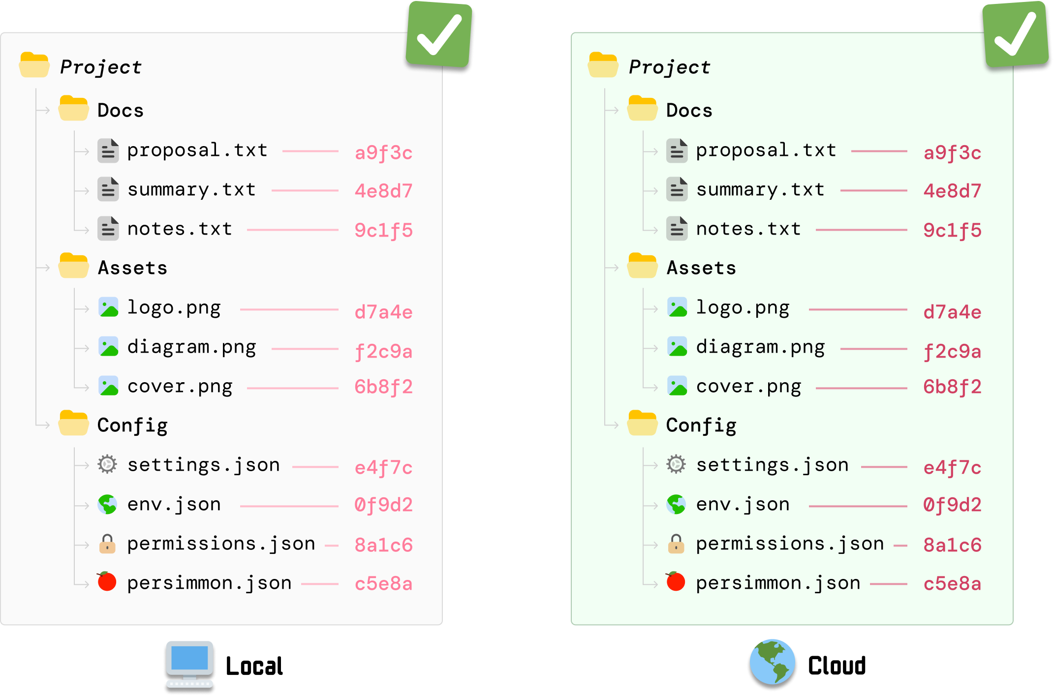 Just like earlier, the hashing order is stable. We hash the subfolder hash values in top-down order, and the values are still identical between our local copy and the cloud copy.