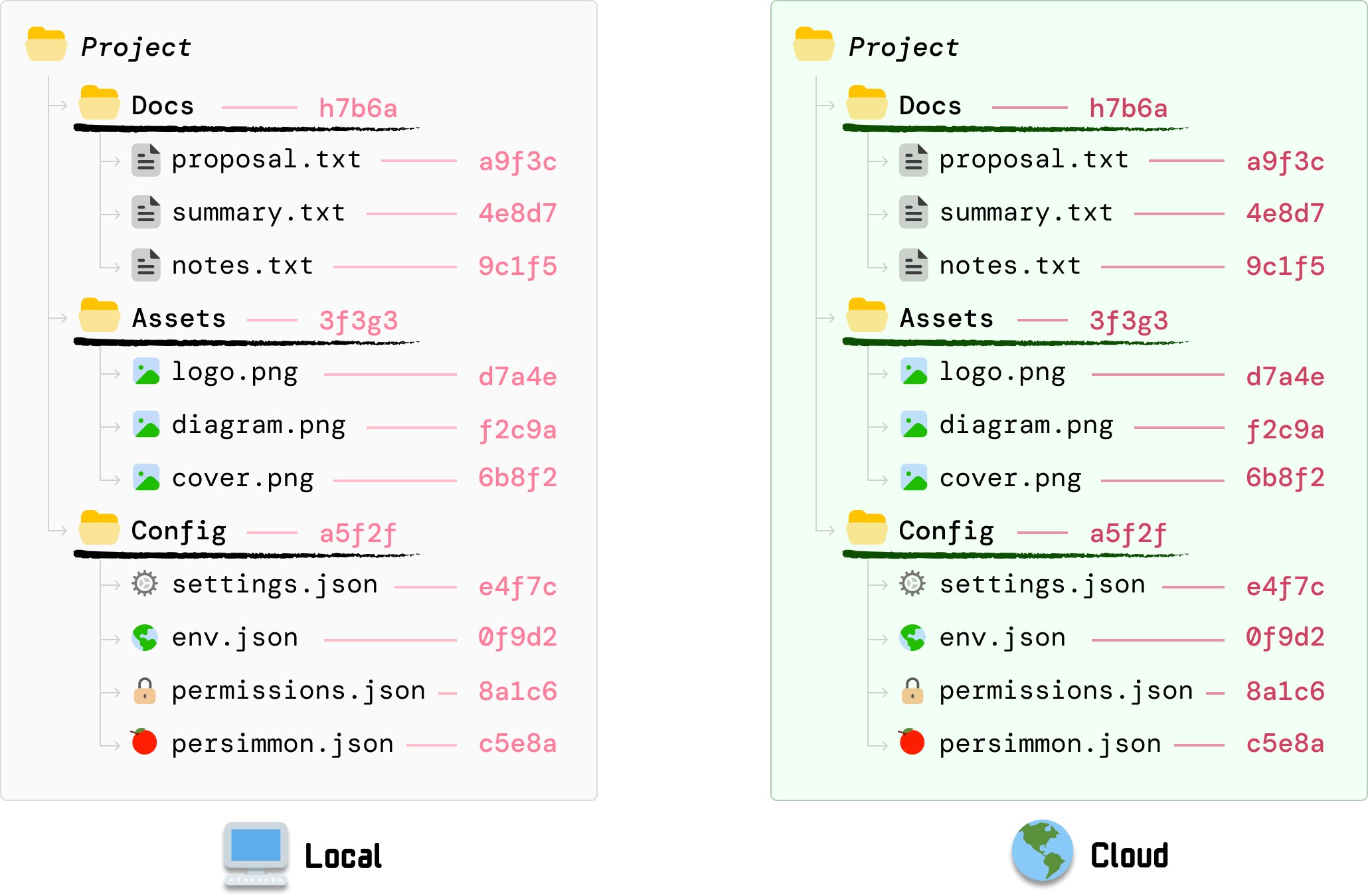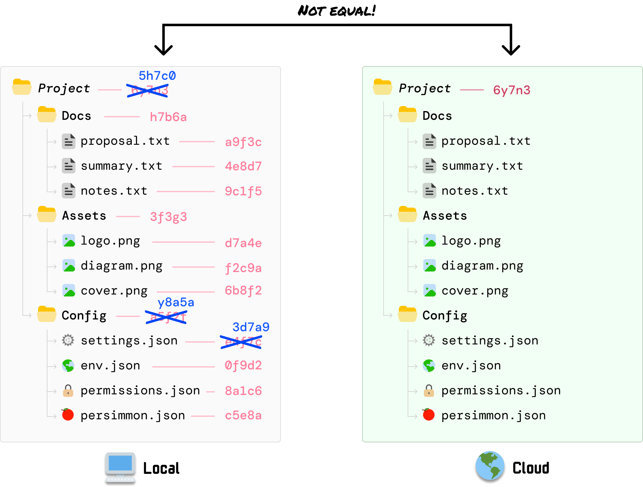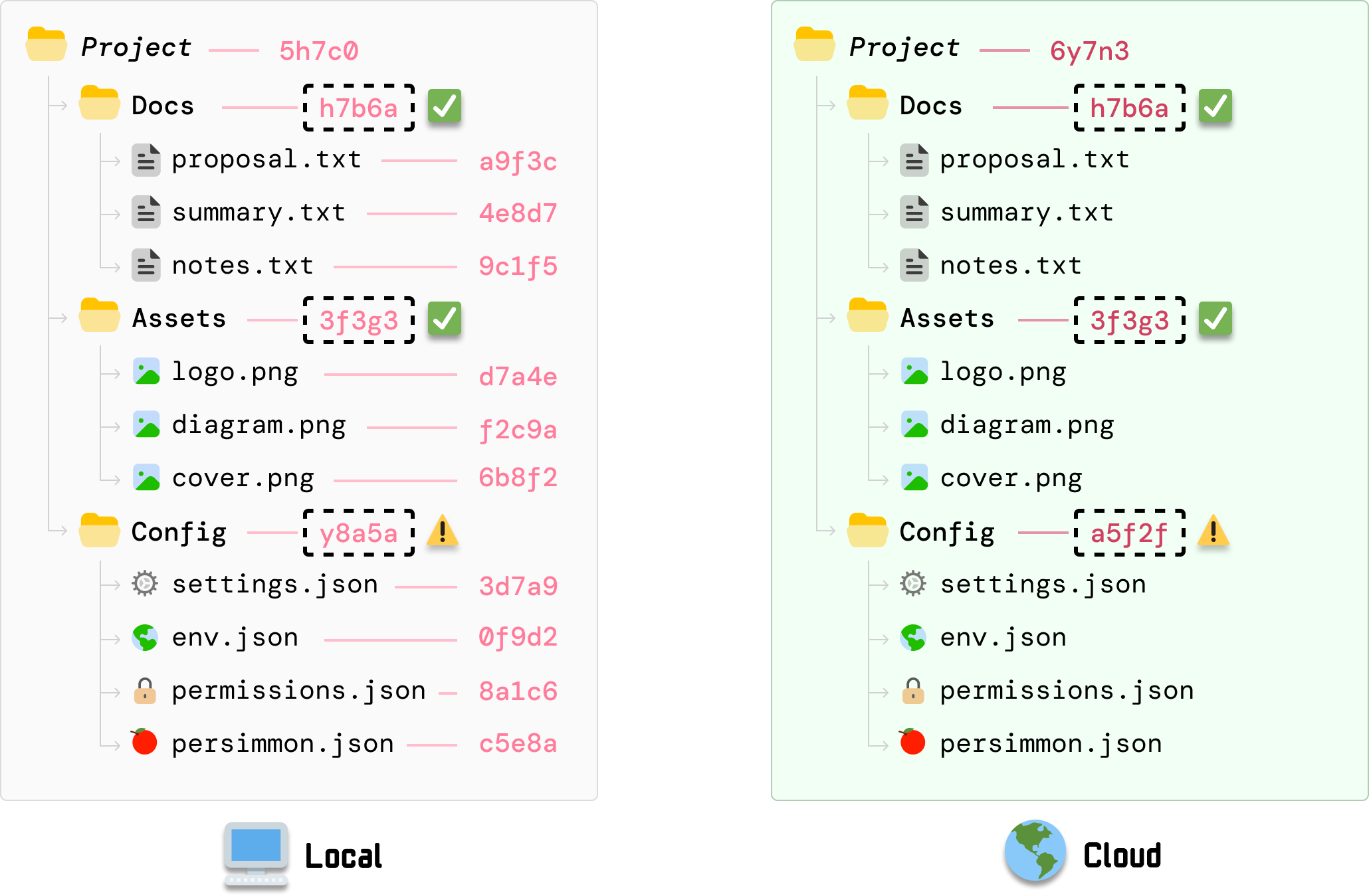 As it walks down the tree and looks at the Docs, Assets, and Config folder, it can compare the local client’s folder-level hash values with what the server had calculated earlier and identify that the hash value for Config is different: