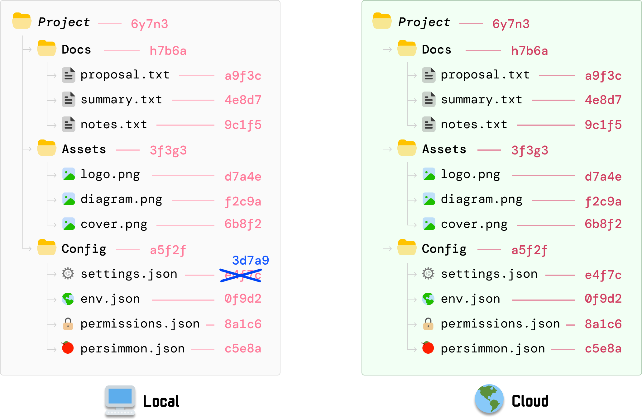 From our local settings.json modification, we know our root hash value has changed as a result. At this point, the root hash value locally is different than what is stored on our cloud server: