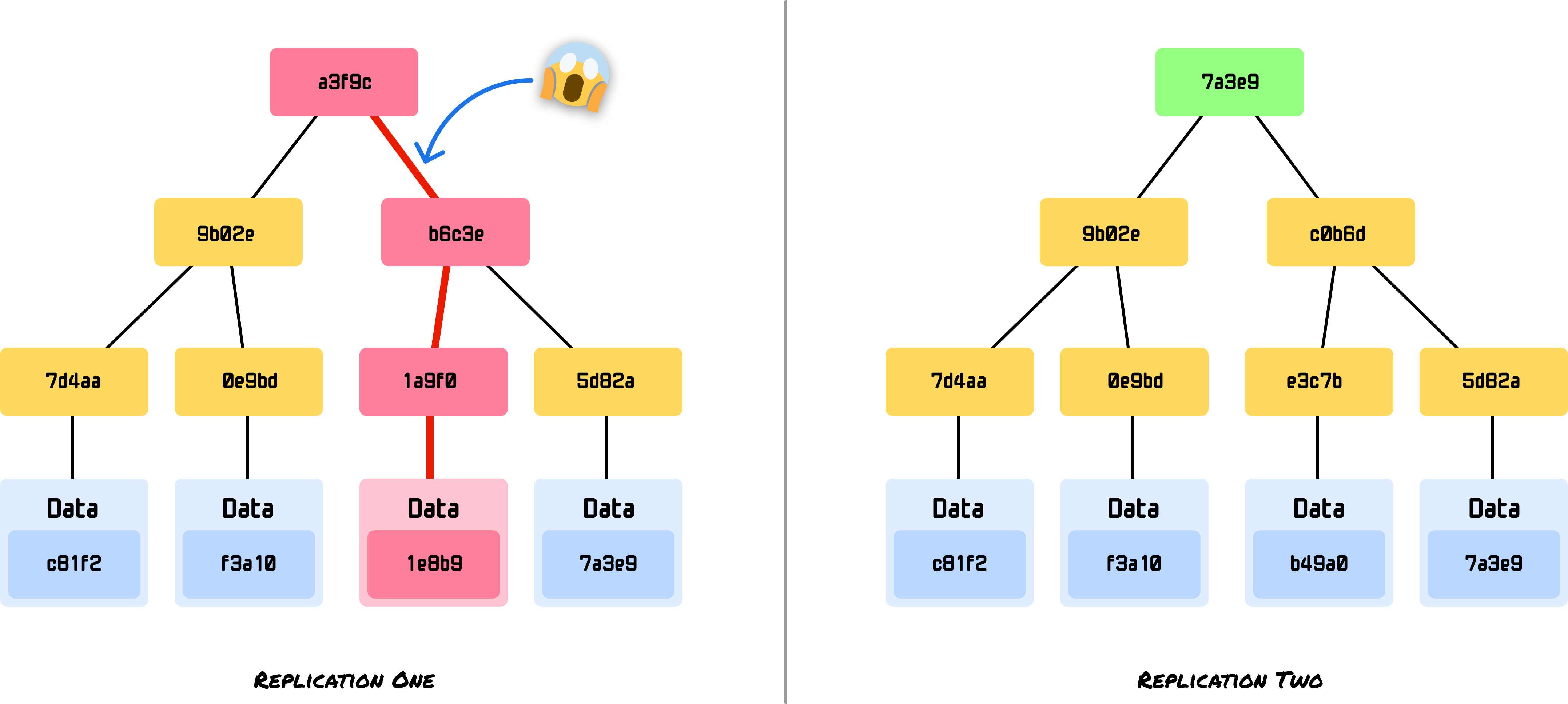 Instead of comparing potentially gigabytes of data, these kinds of systems can compare root hashes and then drill down to find discrepancies and sync only the files that have changed. In mission-critical workloads with many database transactions per second, this efficiency is important to avoid situations where data stays out of sync for long periods of time.