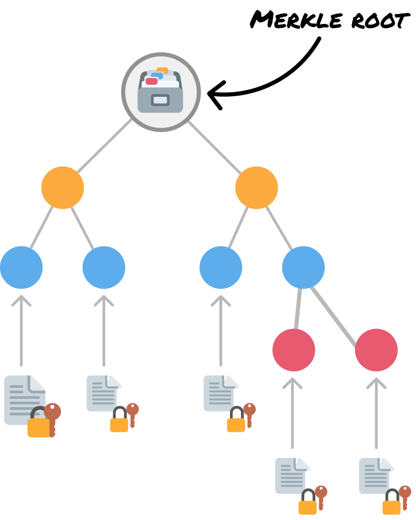 This makes Merkle trees very efficient! For a tree with n leaves, a Merkle proof only requires log_b(n) hashes where b is the branching factor, or number of children per parent. For a million files and we have a binary tree (branching factor of 2) structure, we’d only need about 20 hashes to prove that a file has changed. That’s pretty efficient!