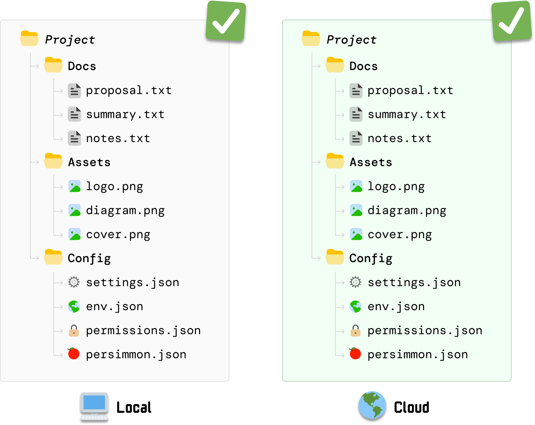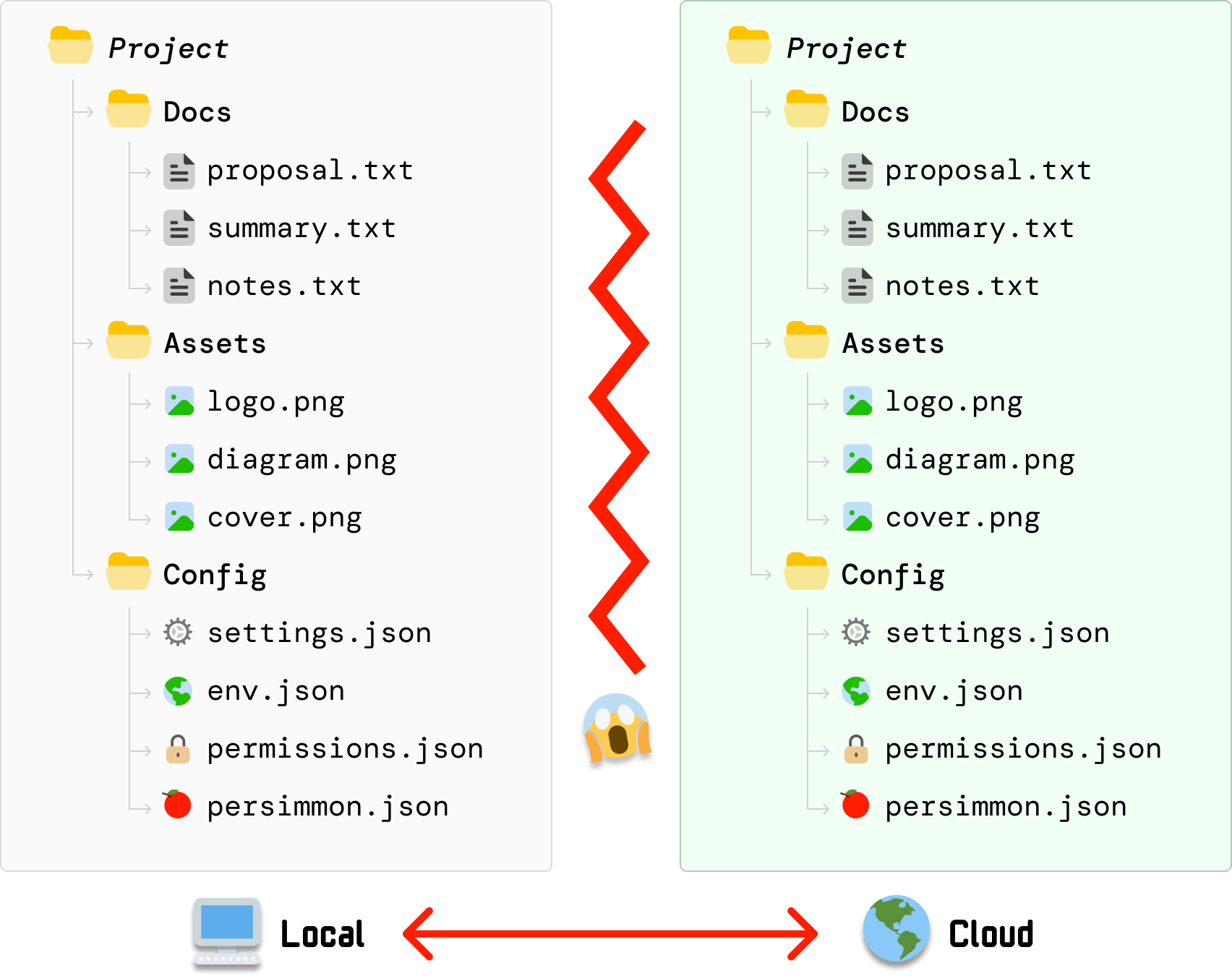 Reliving a moment from a few paragraphs ago, our starting point is where we have our local files and our cloud files in-sync:
