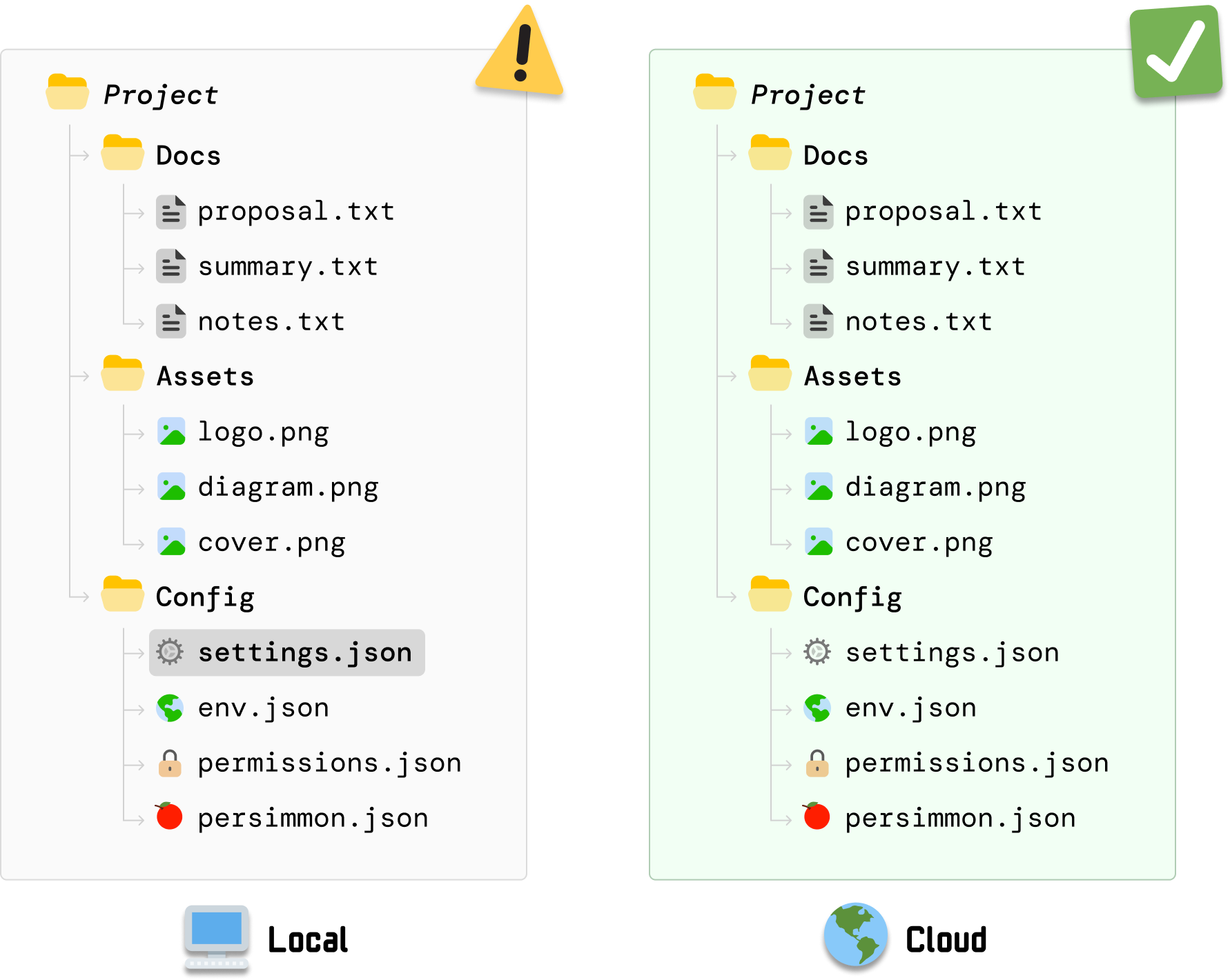 From this happy state where everything is in sync, we are going to make a change to one of our local files. We are going to make a change to settings.json. After we make the change and save it, we have a more recent change in our local settings.json file than its equivalent stored in the cloud:
