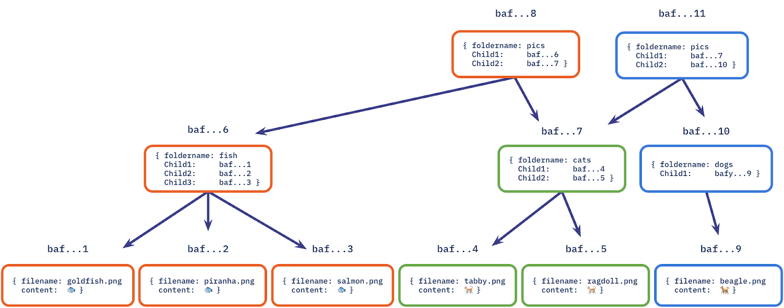 This scenario is nearly identical to the DriveBox example we saw earlier! An example of a distributed storage system that is one level deeper than applications like Box/DropBox/OneDrive/etc. is IPFS (InterPlanetary File System). IPFS uses Merkle trees to create something known as content-addressed storage, as seen in this visualization from their blog: