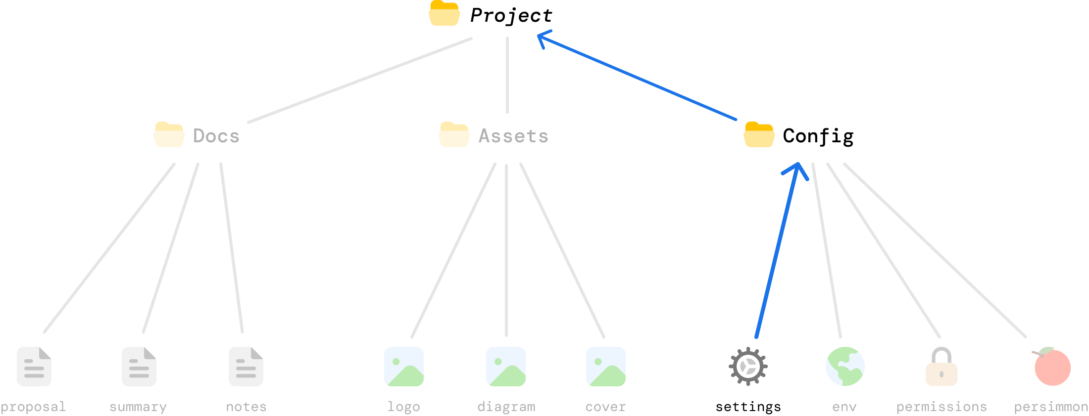 This is the same example as earlier. The only difference is in how it looks to us, but this visualization helps us better see how efficient a Merkle tree is. When a change is made to settings.json, the only bits that are impacted are settings.json itself and the Config and Project folders which rely on the hash value of settings.json for their own respective hash values:
