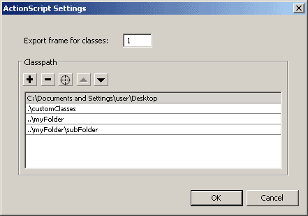 You may have also noticed another option at the top of the classpath dialog allowing you to choose an export frame for classes (local classpath only, disabled for global). This is the equivalent of the export in first frame option for linked movieclip symbols. It simply allows you to specify where in your movie - what frame on the main timeline - you want you're classes defined.