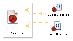 When writing classes for your Flash projects, you may need to create classes that use or depend on other classes. A prime example of this is when using inheritance. If one class extends another class, that first class needs to know where to find and access its super class. Individual .as files, however, do not have their own classpaths. They have no say over where Flash needs to look to find the classes they depend on. That job is up to you at the Flash document level of the Flash movie they're used in. If a class requires the use of another class, or any other .as file (such as an interface), that file needs to be accessible by the main Flash document. This means, if a Flash movie is using a certain sub class, then the super class that sub class extends has to be within a directory in the movies classpath. If the Flash movie has access to the class, then so do all the other classes used in that movie.