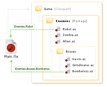 The new name given to the Bombatoss class looks a little familiar - much like object referencing within Flash, as if Bosses.Bombatoss was located in an object named Bosses which was itself located in an object named Enemies. Funny how that is, right? Well if you haven't guessed it already, that is how it will end up in Flash as well. This is where packages provide you with namespaces for your classes as they are used in Flash.