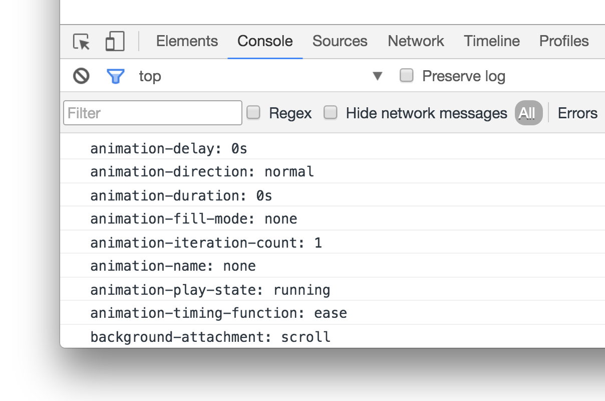 This function goes through all CSS properties that it can find on our CSSStyleDeclarationObject and prints the property and its value to the console. To use it, simply call getAllComputedStyles with a DOM element as its argument. That's it. Here is an example of what our Console looks like when we call this function: